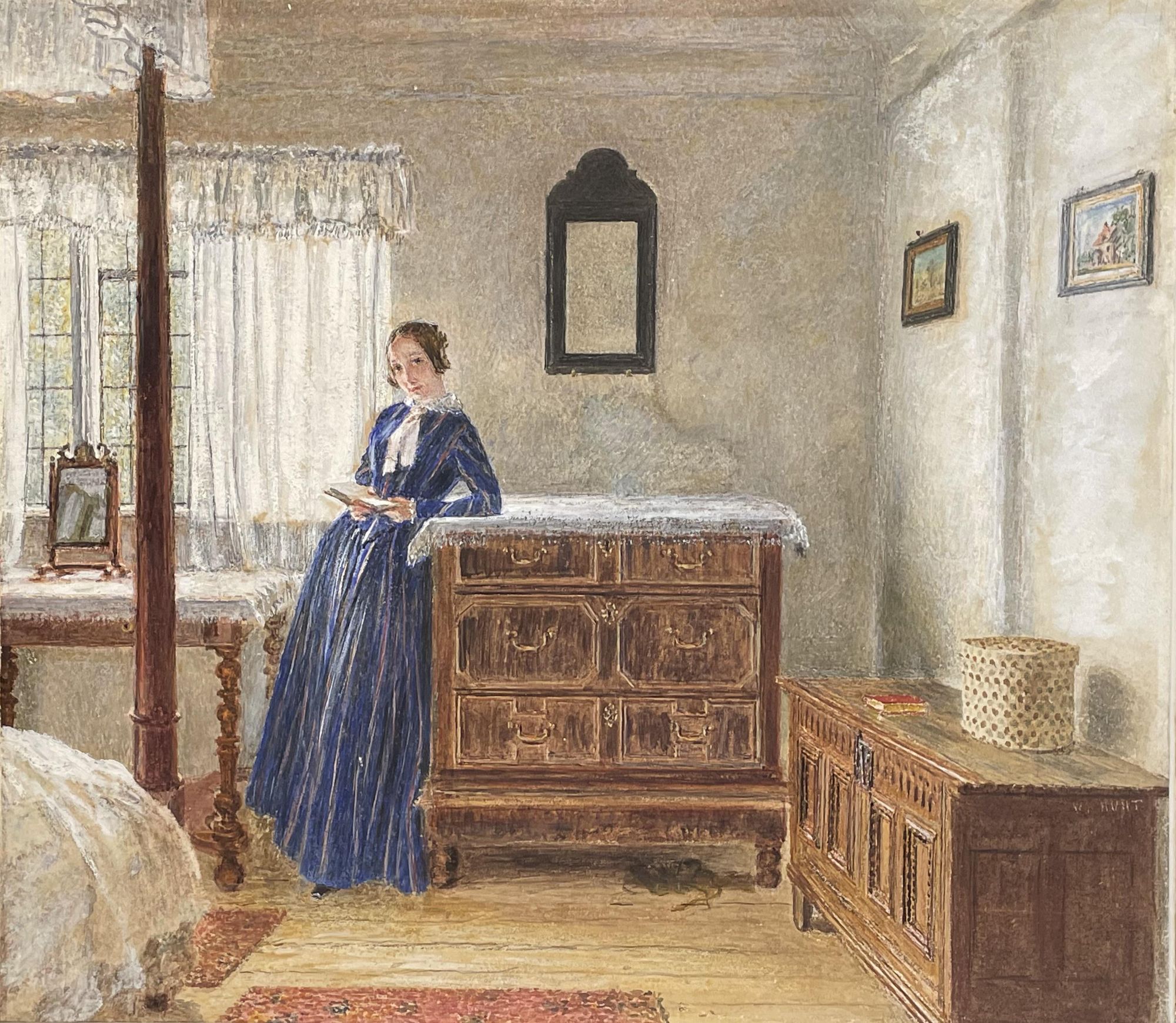 The chest of drawers, table, mirror and bed all appear in several other interior watercolours, including Girl reading at an window, dated 1832, in the collection of the Duke of Norfolk, Arundel Castle and Sunday Morning in the collection of the Huntingdon Library, San Marino.