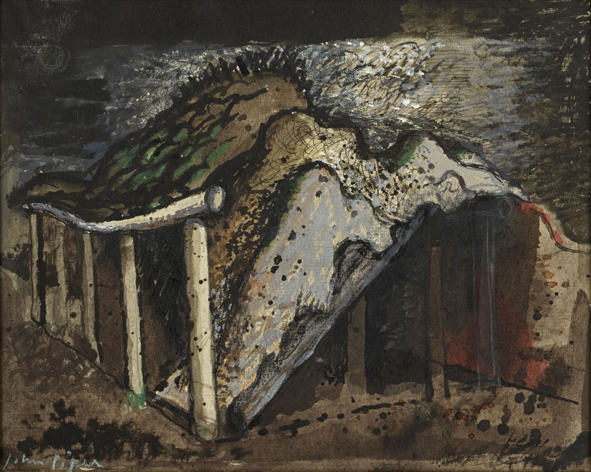 The present work, which dates from 1944, shows the influence of Samuel Palmer (1805-1881) which is most evident in Piper's monochrome works of the 1940s. Piper was in fact central to championing the rediscovery of the earlier artist's work, which along with William Blake inspired a generation of landscape artists working in the 20th Century, including John Minton, Paul Nash and Graham Sutherland, who were looking for new ways to depict landscape and to convey ideas of spirituality through nature. Such was the power of the artist over the later generation that Sutherland described him as 'a sort of English Van Gogh'. Piper was particularly inspired by Palmer's Shoreham period work, with its intense palette and use of line to create a poetic vision. The mystical qualities inherent on Palmer's work of the period, resonated with Piper's desire to capture a sense of spirituality in his own work.