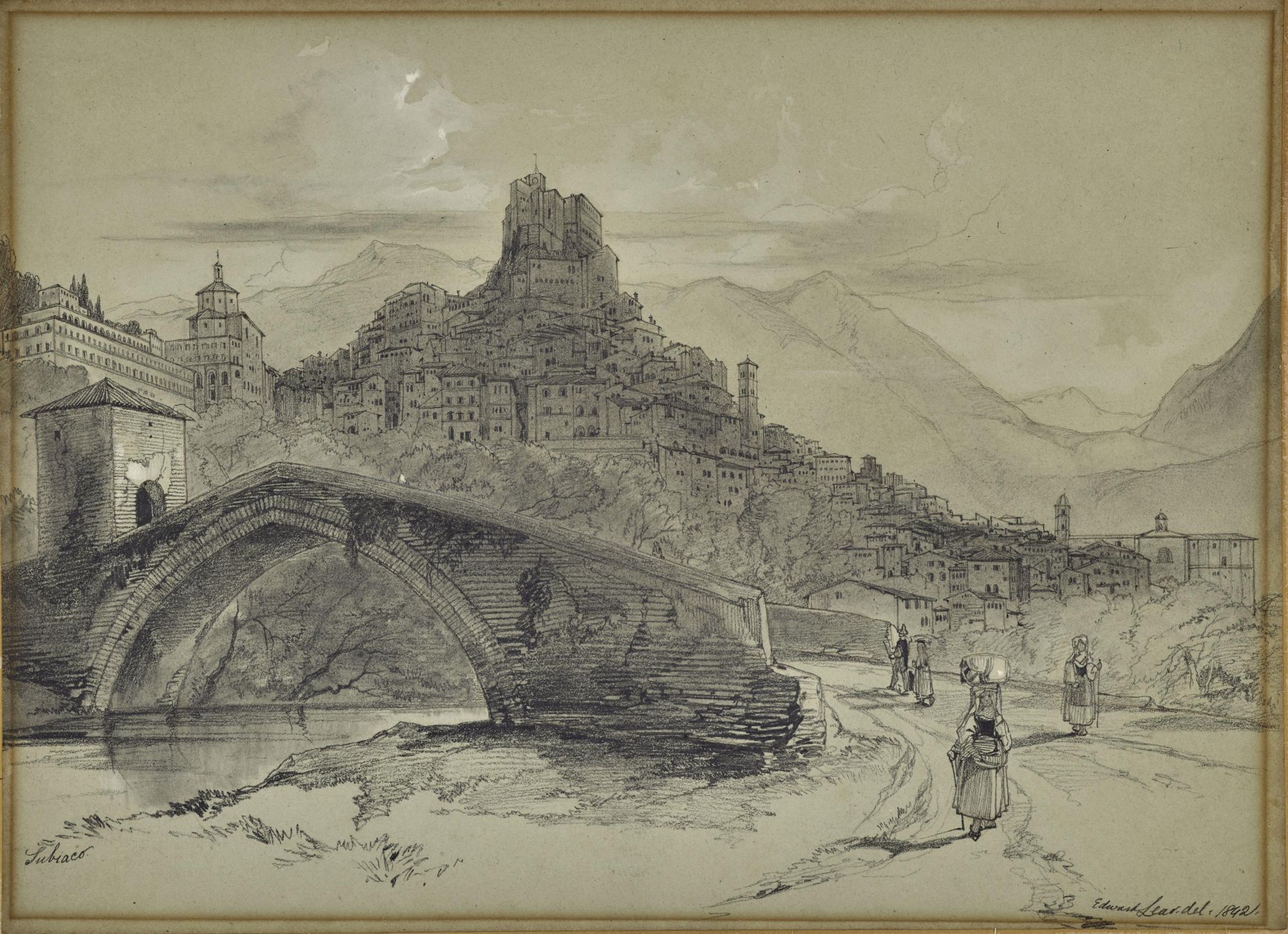 Signed and dated lower right: Edward Lear. del. 1842 and inscribed lower left: Subiaco