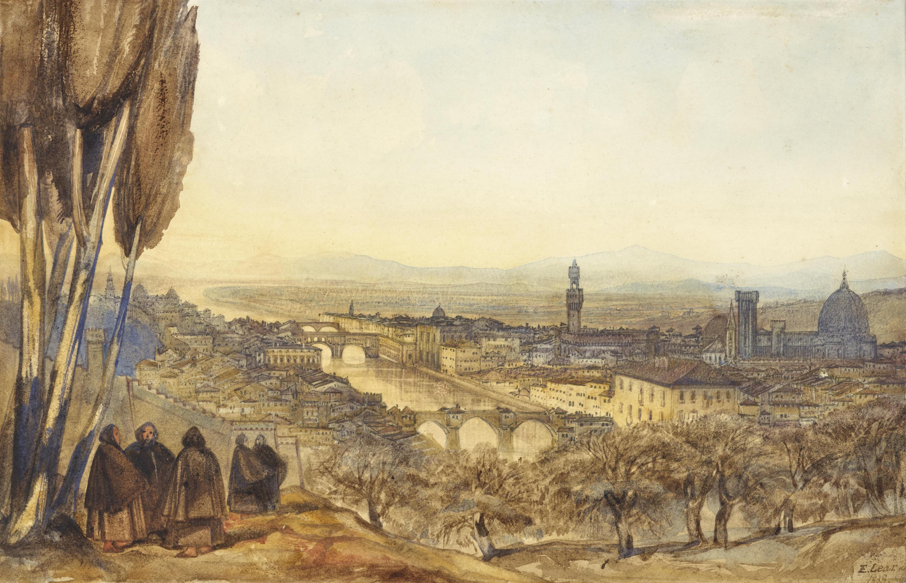 This dates from Lear's first European trip. He left England in the summer of 1837 and did not return permanently to London until the late 1840s. He reached Florence in November and recalled `the clear lilac mountains all round it - the exquisite walks on every side to hills covered with villages, convents and cypresses, where you have the whole city beneath you - the bustle of the Grand Duke's court and the fine shops - the endless churches - the Zebra Cathedral of black and white marble - the crowds of towers and steeples - all these make Florence a little Paradise in its way - if it were but hotter. - Oh! How I used to go shivering about!' (quoted in Jenny Uglow, Mr Lear - A Life of Art and Nonsense, 2017, pp.110-111). He left the city with some regret but the cold urged him southwards and he was in Rome in mid December.