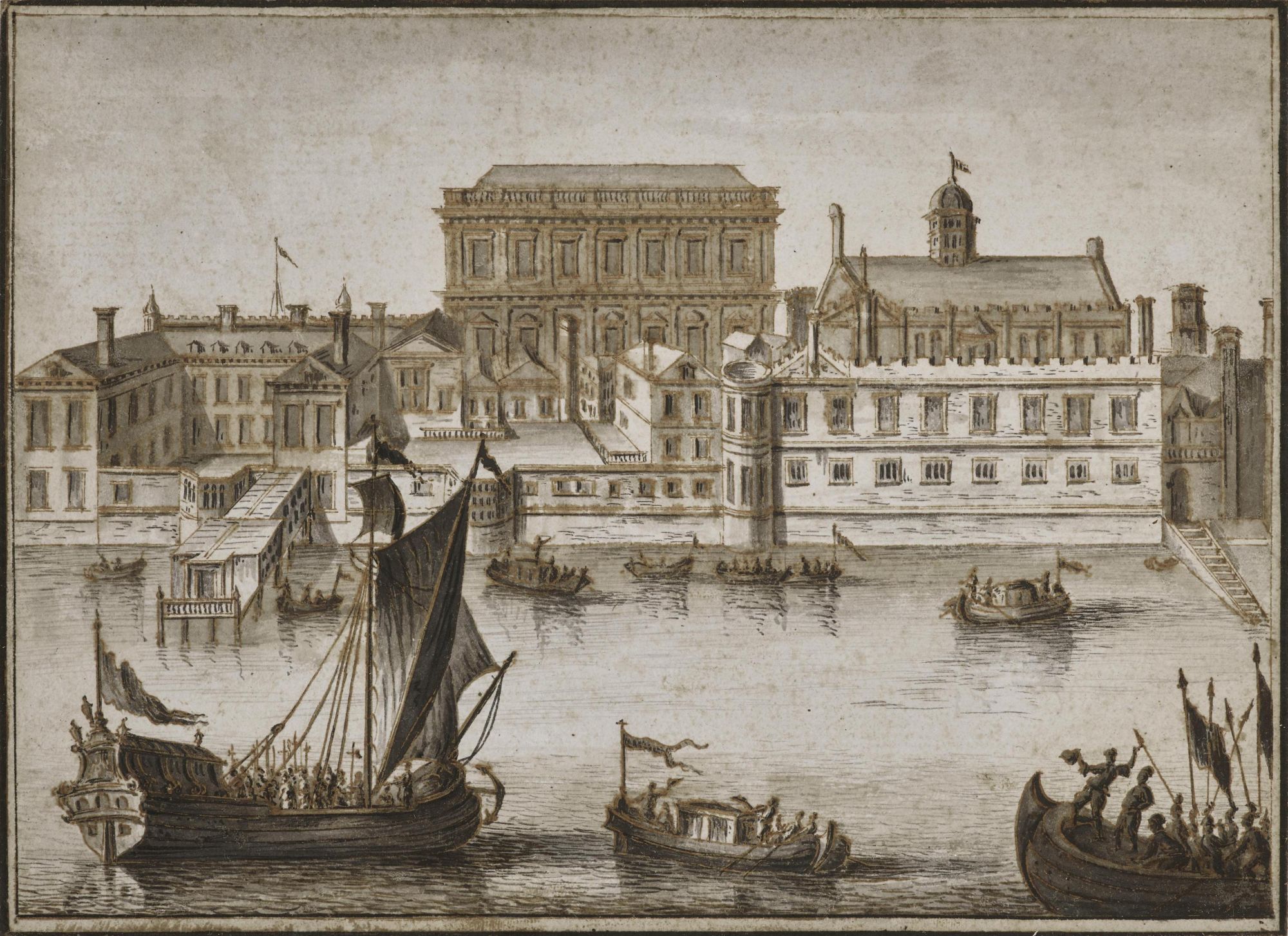 The present drawing is based on a print from 1707 by Pieter van der Aa (1659-1733) which depicts the palace from the Thames. It captures from left to right, the King's or Volary Lodgings (built between 1666-8), the Privy Bridge extending into the River (begun under Wolsey, rebuilt under Henry VIII and remodelled between 1576-8). The Queen's Lodgings (1666-8), sit next to the river and in front of the Banqueting House (built by Inigo Jones between 1619-22) and to the right lie the Privy Kitchen range with lodgings above (begun under Cardinal Wolsey). Just behind this is the Chapel Royal and with one of the towers of the Holbein Gate (built 1531-2) visible just behind. The Whitehall Stairs, the public landing place, is visible to the far right.